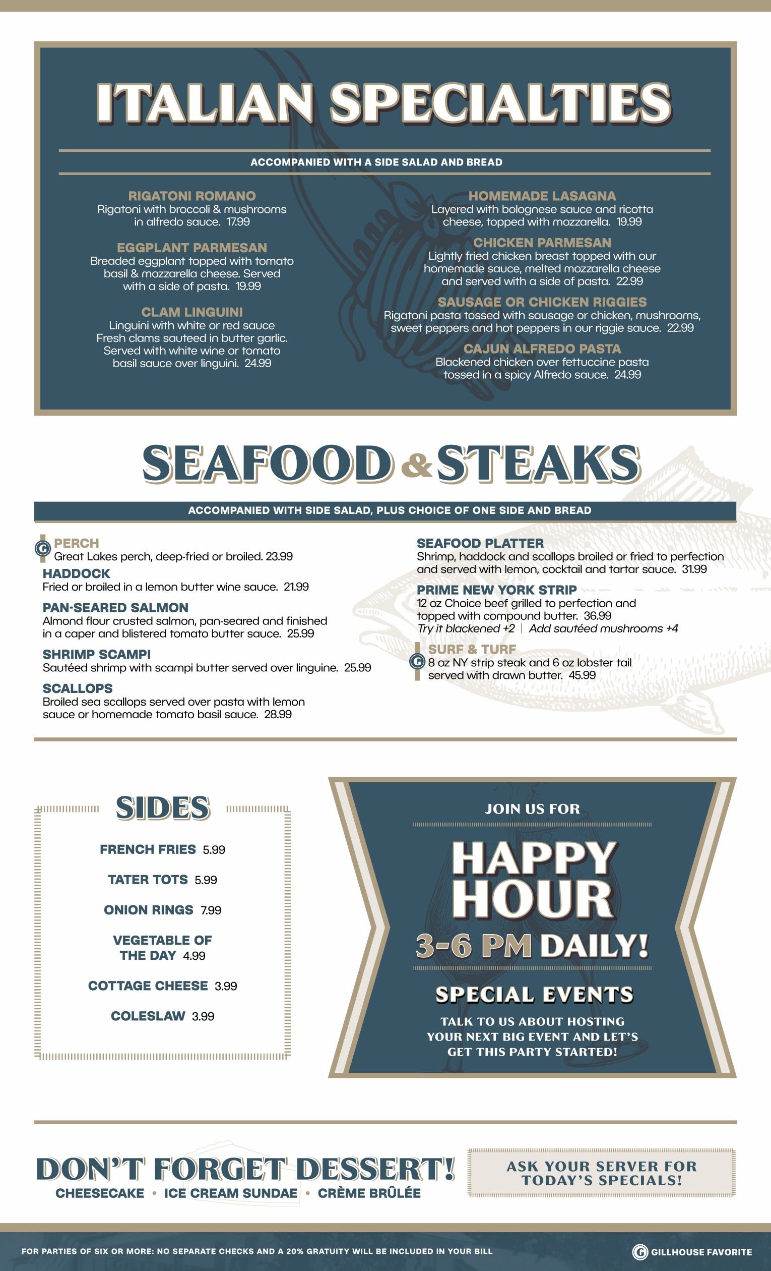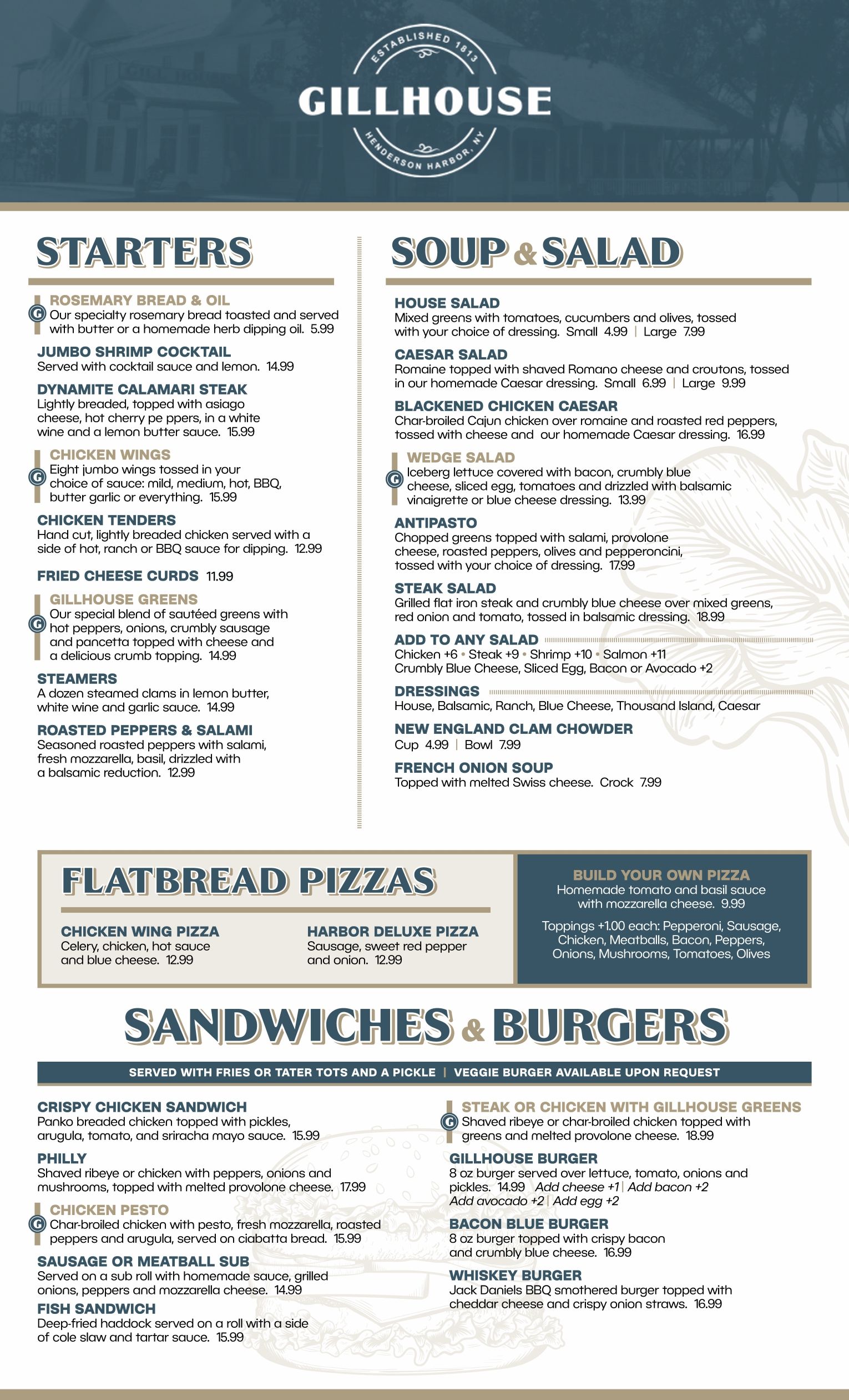 Enjoy delicious, local cuisine with our new Gillhouse Menu! The Gillhouse offers a fresh selection of seasonal salads, seafood, Italian and American classics. We will be open for lunch, dinner, tavern menu and Sunday brunch.
